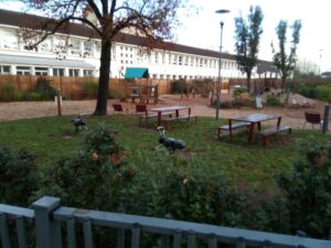 Le préfabriqué a été détruit de manière à aménager un square public, livré début 2025. Une partie des locaux a été reprise par le groupe scolaire (pour le centre de loisirs). Une réflexion est en cours pour créer un équipement de petite enfance (crèche).