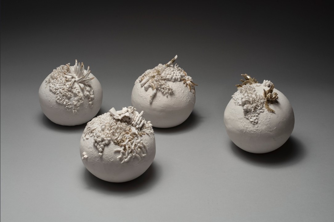 Depuis, ses petits mondes se sont « globisés ». Elle a arrondi des plaques, formé puis assemblé des demi-lunes et sur la boule ainsi créée, c’est une maison abandonnée ou un jardin envahi de ronces. Il y a sur ces sphères (aplanies sur un pôle pour les rendre stables) une sorte de nature ensevelie qui repousse.
